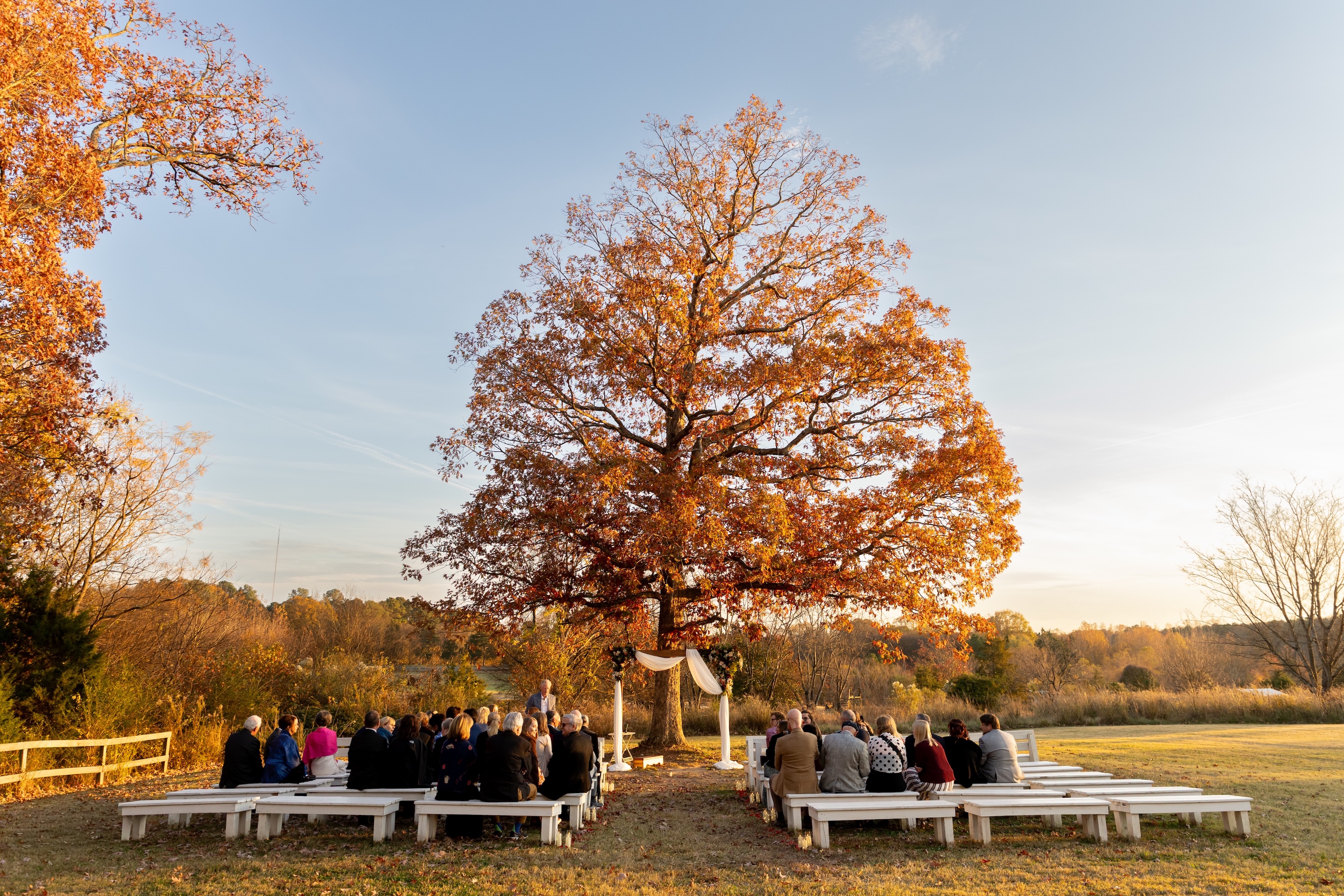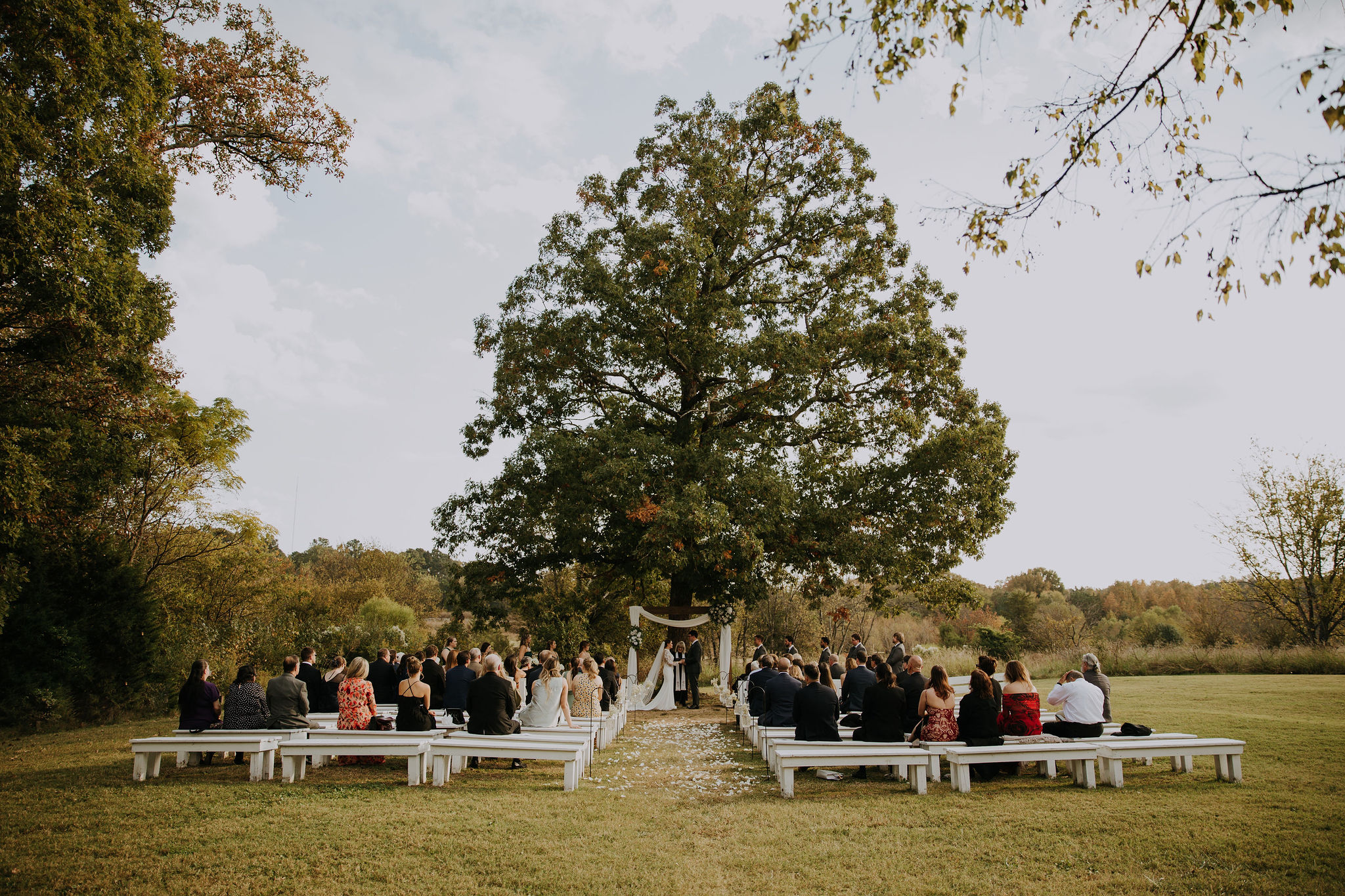 The Meadow offers a naturally stunning ceremony setting nestled within the farm’s rolling pastureland. Couples exchange vows beneath the iconic oak tree, surrounded by open skies and sweeping views. The beauty of the landscape speaks for itself, creating a timeless backdrop that feels effortless and unforced.The Meadow is nestled within one of the farm's beautiful green pastures, offering a breathtaking setting for your special day. Surrounded by natural beauty, you'll exchange your vows beneath our iconic oak tree, with sweeping views of acres of pristine pastureland, creating a truly unforgettable backdrop.
